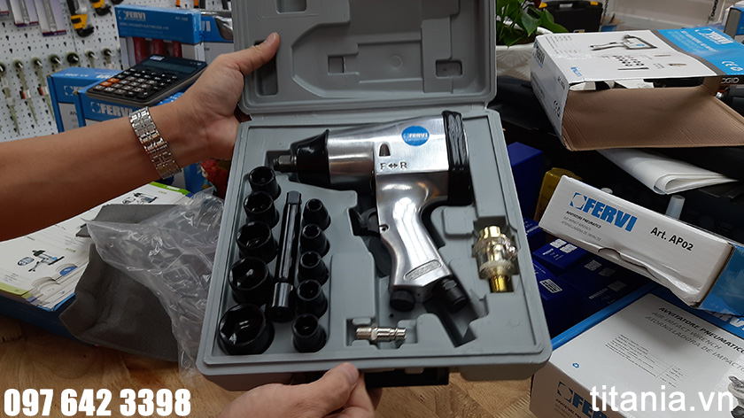 0044 bộ súng xiết ốc bằng khí nén 13 chi tiết, vuông 1/2 inch. FERVI - Italia. Bao gồm đầu khẩu đen từ 9 đến 27mm, thanh nối dài và các phụ kiện tiêu chuẩn. Sẵn sàng hoạt động. Tất cả trong một vali chuyên dùng.