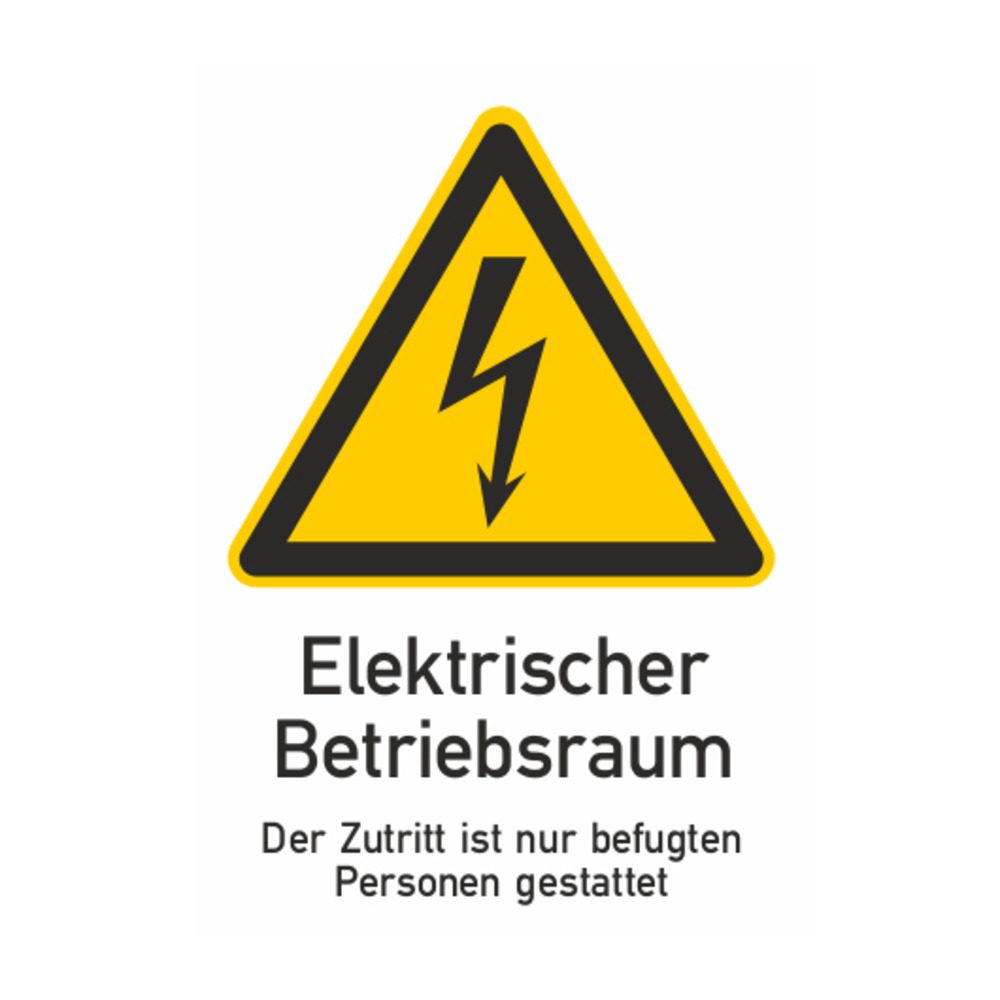 Warning sign for electrical engineering. Material: plastic, text: "Electrical operating room...", symbol: "Warning of dangerous electrical voltage"; color: yellow; dimensions: 297x210 mm.