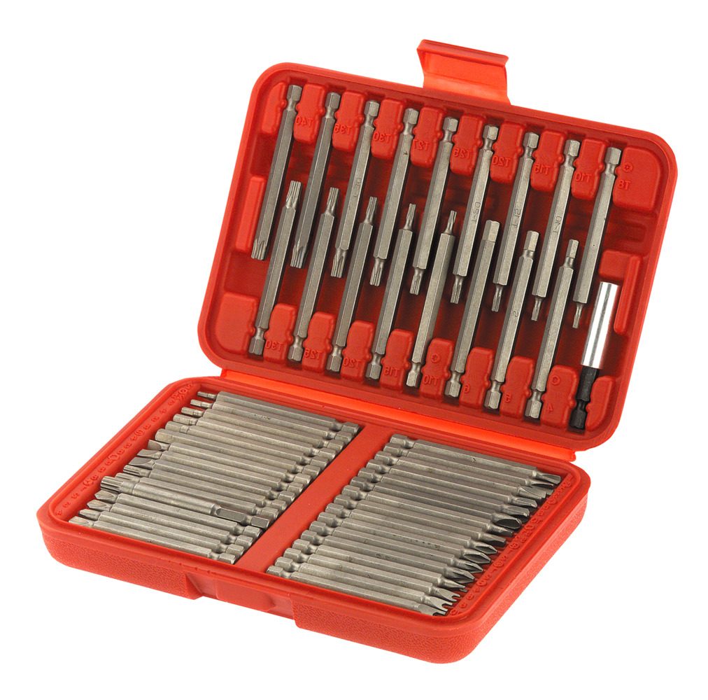Special 75 mm bit set, 50-piece, for working on all types of screws, especially safety and special screws, thanks to extra length of 75 mm, also ideal for use in hard-to-reach places where space is limited, with standard 1/4" hexagon socket for cordless screwdriver and handheld screwdriver operation, made of chrome vanadium steel, clearly arranged and slip-proof, stored in impact-resistant plastic box (195 x 135 x 38 mm).
