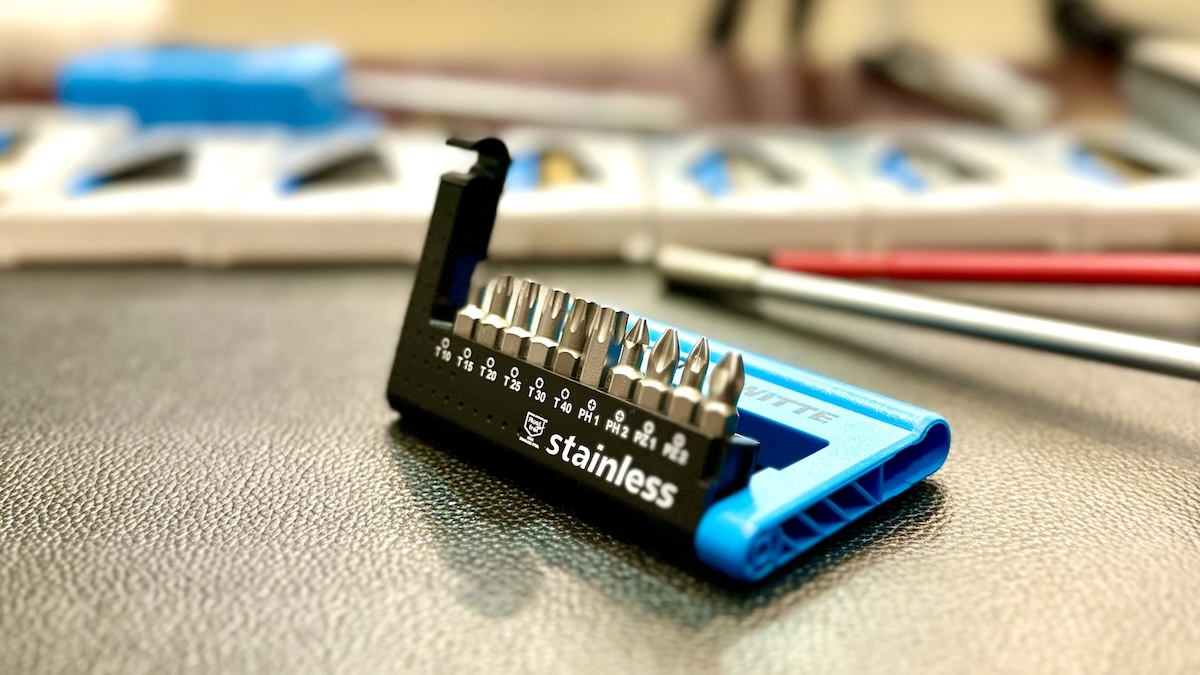Hộp đựng đồng thời đóng vai trò tay vặn. Cấu trúc gập gọn cho phép bỏ túi dễ dàng khi di chuyển. Đầu giữ mũi vít thay nhanh dài 60 mm sử dụng chuôi E6.3 chuẩn 1 phần 4 inch. Thao tác tháo lắp mũi vít diễn ra nhanh và liền mạch.