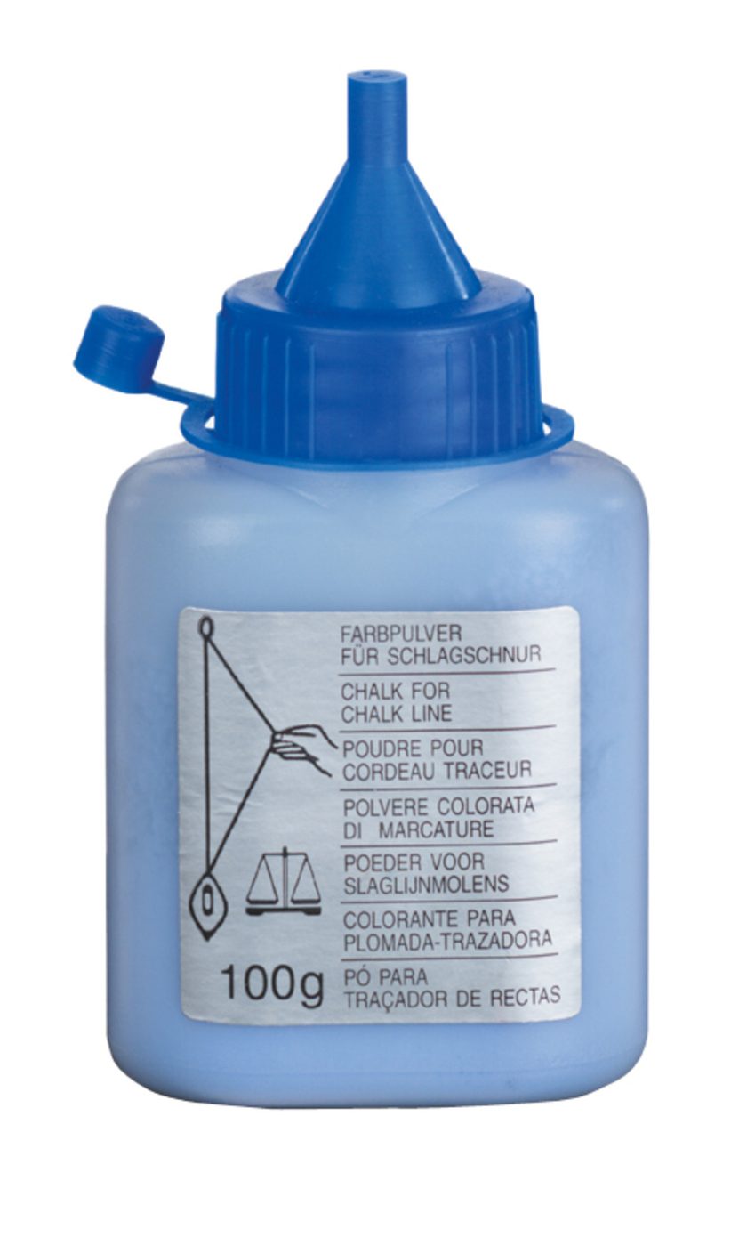 Impact cord roller with push system, storage space for toothed hooks and belt clip, body made of metal, cord length 15 m, including 60 g color powder. Color powder, grease and oil free, in plastic bottle; blue; 100 g