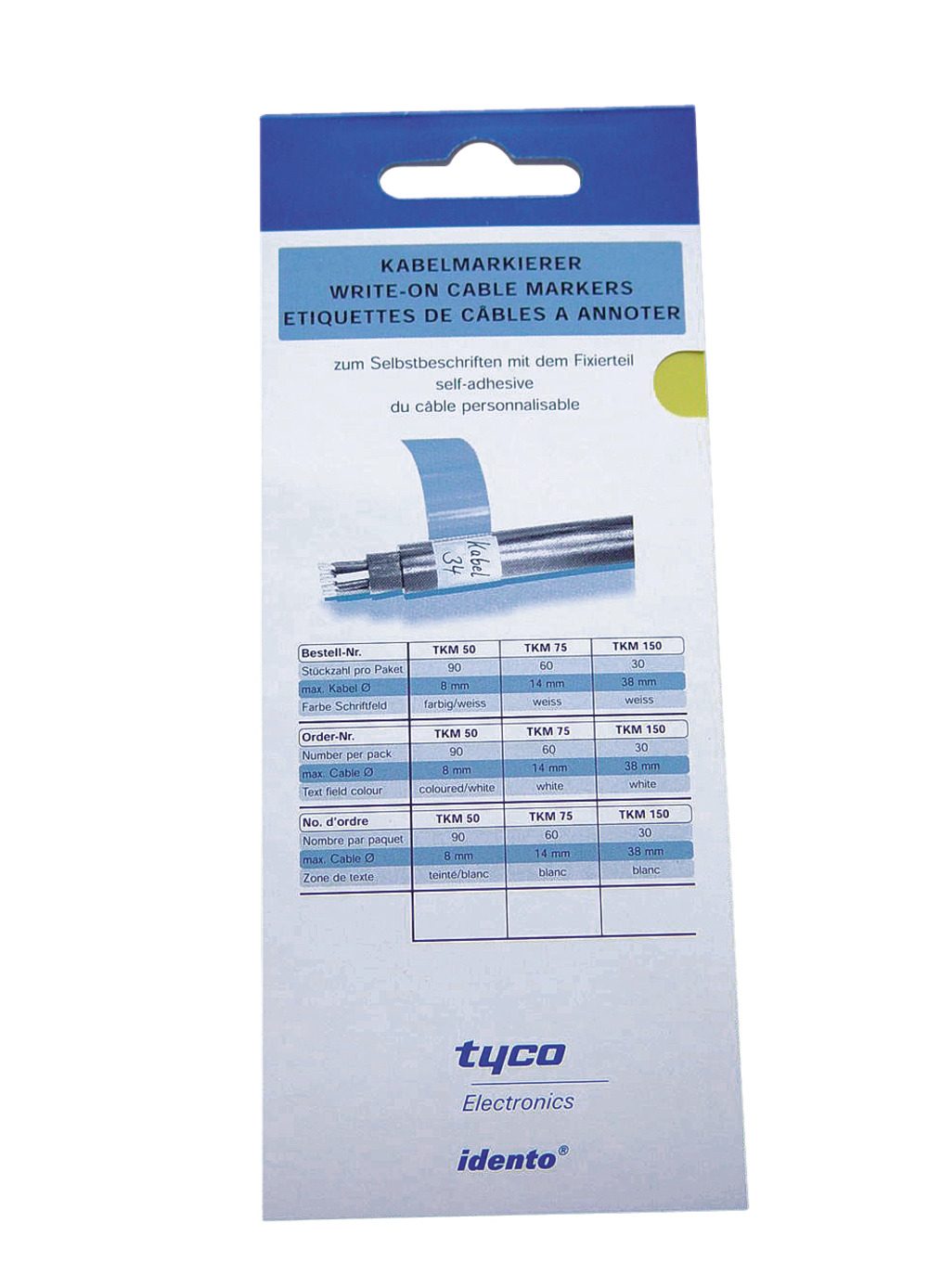 Temperature-resistant from -30°C to +120°C, permanent adhesion, high UV resistance. Resistant to dirt, water, alcohol, and petroleum-based oils. Can be written on with pencil, ballpoint pen, printer, etc. Pocket packaging. Specifications: Labeling area: 25 x 25 mm, maximum cable diameter 38 mm, pieces per block: 32, length: 150 mm. Packing unit: 1.