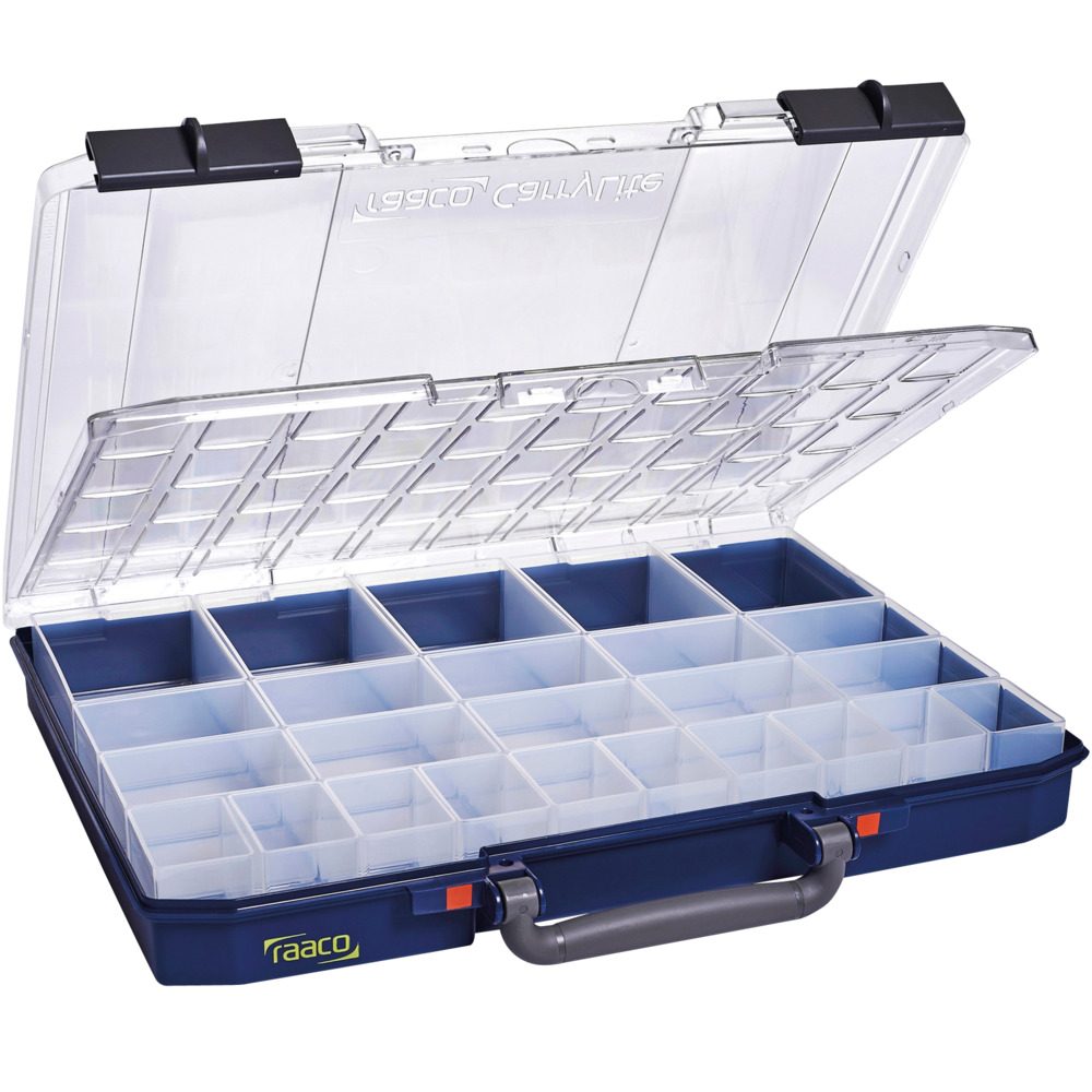 CarryLite 55 5x10 DLU, incl. 25 inserts with compartment for documents, equipped with carrying handle and 2 sliding latches, 2 red markings on the latches indicate if the case is closed correctly. Assortment case incl. sandwich lid with U-profiles, which prevent the contents from slipping during transport, sandwich lid with insertion compartment, e.g. for up to 5 loose sheets of paper à 80 g, incl. 10 inserts type A9-1 and 10 inserts type A8-1 and 5 inserts type A7-1, color: raaco blue. Load capacity: 10 kg, weight: 1.722g; DxWxH 330x413x58 mm; Grid 5x10