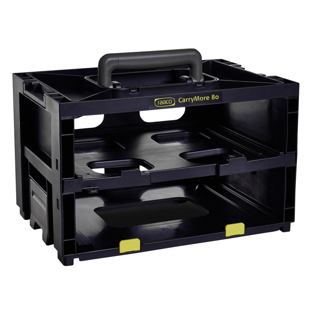 CarryMore 80, storage and transport system, for storage of 2 CarryLite 80 4x8 assortment cases,, with ergonomic carrying handle and locking mechanism for fixed connection of several CarryMore carrying frames, stop edges preventing the CarryLite cases from sliding out, carrying capacity: 25 kg, weight: 1,935g, color: black. Finish: empty; DxWxH 278x386x241 mm.