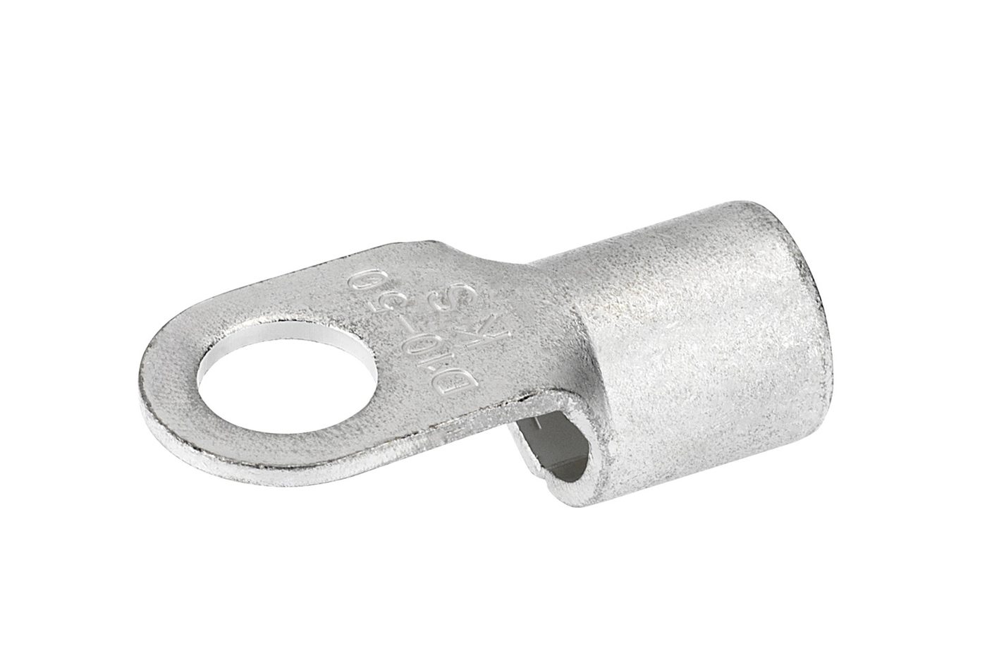 Crimp terminals, ring type Cu, DIN 46234. Technical data - Material: Cu-ETP according to DIN EN 13600 - Surface: electro tin plated, other surfaces on request - Especially suitable for fine stranded conductors according to IEC 228 . Cross-section: 50 mm²; bolt-Ø 10 mm; nominal size according to DIN: 10-50; D1: 10.5; D3: 16; A: 18; B: 34; L: 1.8; S: 1.6; weight per 100 pcs ~kg: 1.6; PU/pc: 1.