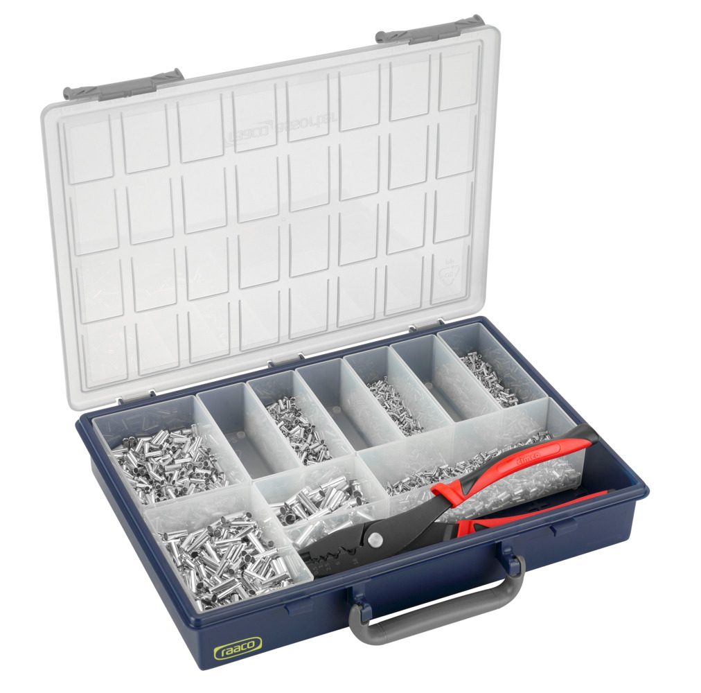 Non-insulated wire end ferrules, assorted, 4,350 pieces, in raaco assortment box PSC-Vario 340, including non-insulated wire end ferrules and universal notched pliers (CIMCO article no. 10 1904). Version: 1.0 mm² x 6 mm, 1,000 pieces (CIMCO article no. 18 2056) | 1.5 mm² x 7 mm, 1,000 pieces (CIMCO article no. 18 2060) | 2.5 mm² x 7 mm, 1,000 pieces (CIMCO article no. 18 2070) | 4.0 mm² x 9 mm, 500 pieces (CIMCO article no. 18 2078) | 6.0 mm² x 12 mm, 500 pieces (CIMCO article no. 18 2076) | 10 mm² x 18 mm, 100 pieces (CIMCO article no. 18 2096) | 16 mm² x 18 mm, 100 pieces (CIMCO article no. 18 2004) | PU/unit: 1.