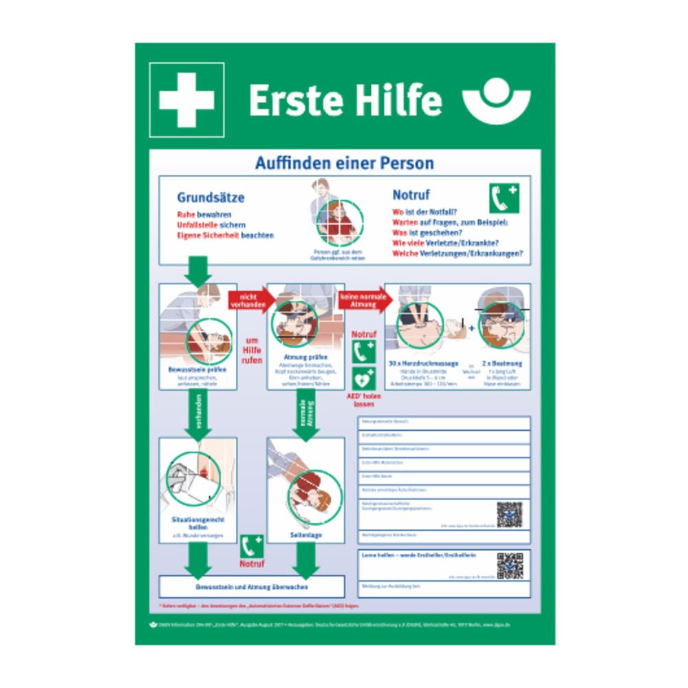 Emergency poster "Instructions for first aid" according to DGUV-Information 204-001. Material: plastic. Format: 410x590 mm. Edition August 2017