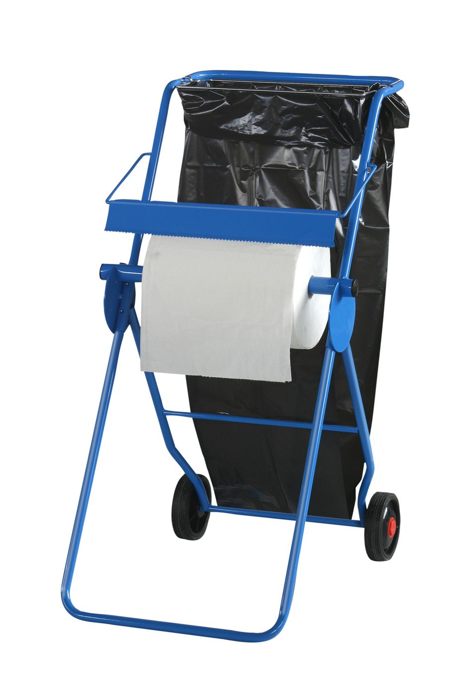 Floor stand with waste bag holder. Cleaning towel roll holder for workshop towel rolls up to 42cm roll width.