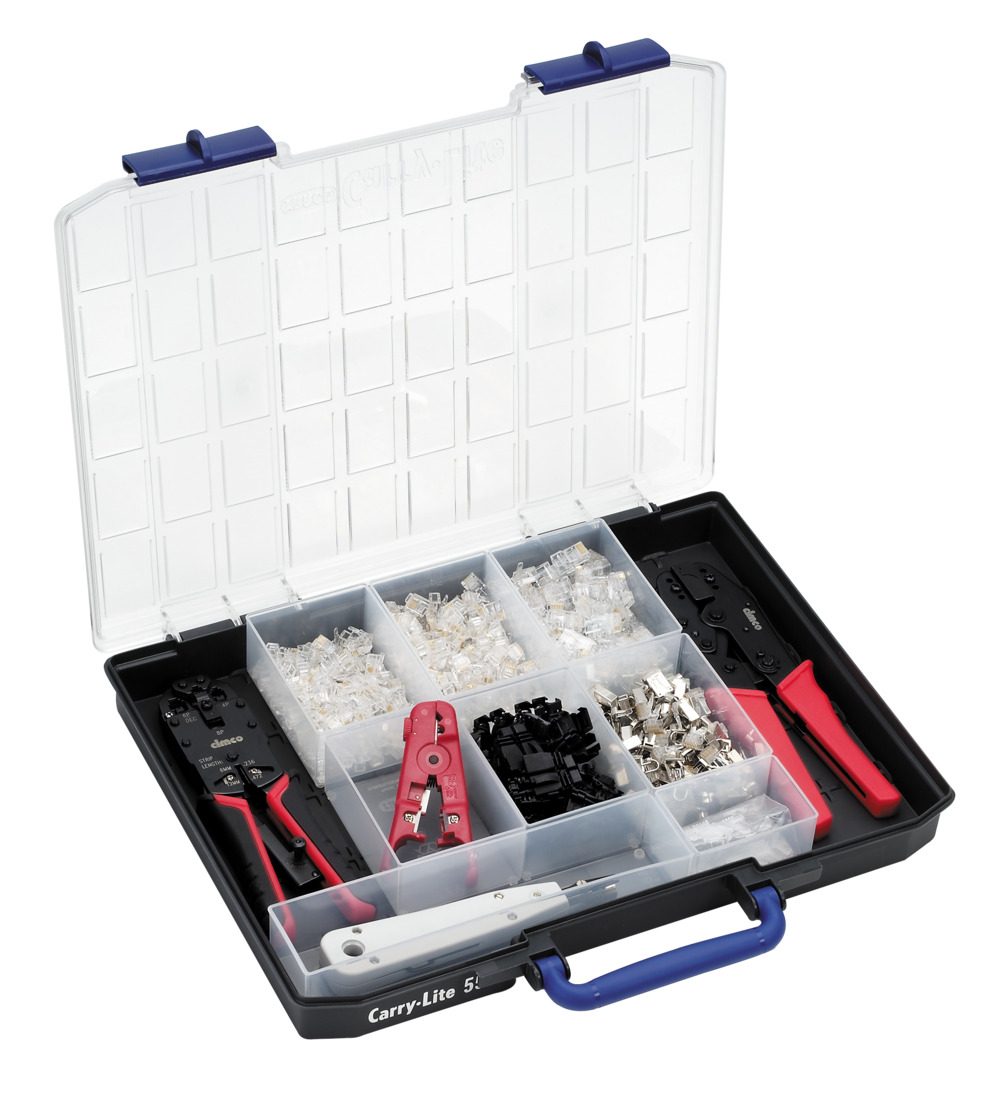 Service case network technology -raaco service case CARRY-LITE 55- with contents: Stripper Data Strip (CIMCO article no. 12 0092), applicator tool Economy (CIMCO article no. 11 8017), crimping pliers 4-, 6-, 8-pole unshielded (CIMCO article no. 10 6200), crimping pliers 8-pole shielded (CIMCO article no. 10 6201), 100 pc. Modular plug 4-pin RJ 10 unshielded CIMCO item no. 18 3000), 100 pcs.