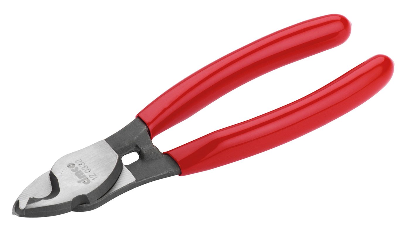 Cable cutters, a universal tool for copper, aluminum, and coaxial cables. This tool is suitable for stripping, insulation removal (special zone on the cutting head), and precise cutting of cables; handles feature a simple dip coating. 10 mm diameter or 50 mm², length: 160 mm