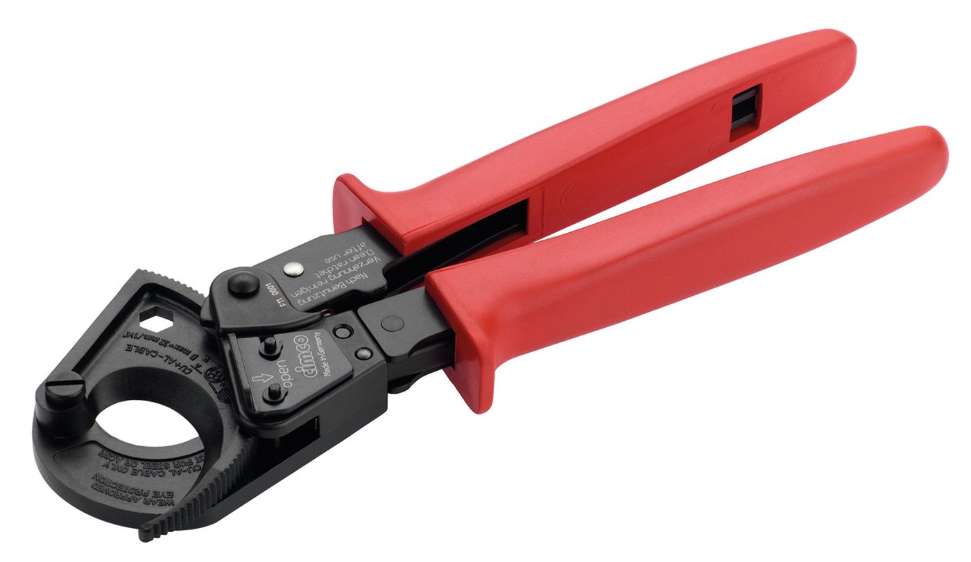 Ratchet-driven cable cutter, one-handed operation thanks to optimal lever ratio and step-by-step cutting, with the ability to release the cutter in any cutting position. All parts made of high-strength special steel; cutting edges and stress-bearing parts are tempered or hardened; surface is burnished. Ergonomically shaped soft-grip handles; for copper and aluminum cables, single- and multi-conductor. For cables up to a diameter of 32 mm, solid: 1 x 150 mm², stranded: 4 x 35 mm², length: 250 mm.