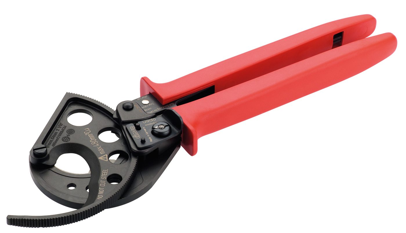 Ratchet-driven cable cutter, one-handed operation thanks to optimal lever ratio and step-by-step cutting, can be unlocked in any cutting position. All parts made of high-strength special steel; cutting edges and stress-bearing parts are tempered or hardened; burnished finish; ergonomically shaped soft-grip handles; for copper and aluminum cables, single- and multi-conductor. For cables up to a diameter of 62 mm, solid: 1 x 500 mm², stranded: 4 x 185 mm², length: 310 mm.