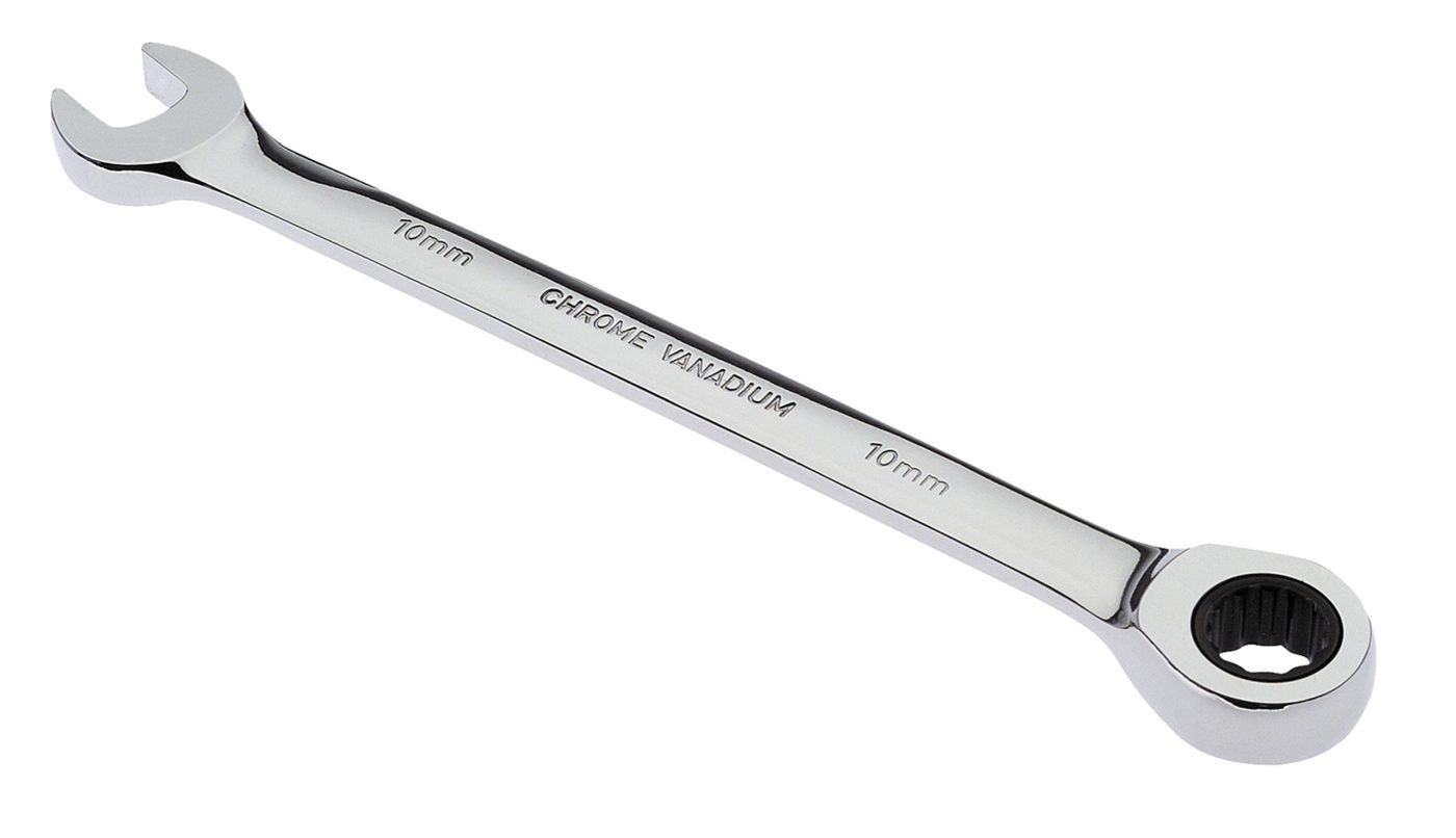 Ratchet combination wrench with fine toothing for ratcheting loosening or quick tightening of bolts and nuts in one go. 72 teeth stand for high performance and low return angles from as little as 5°. Left or right rotation by simply turning the wrench, with additional color marking. Open-end wrench tool with 15° offset for ergonomic working. Drop-forged from chrome vanadium steel, specially hardened, highly polished, nickel-plated and hard-chrome plated. 8 mm