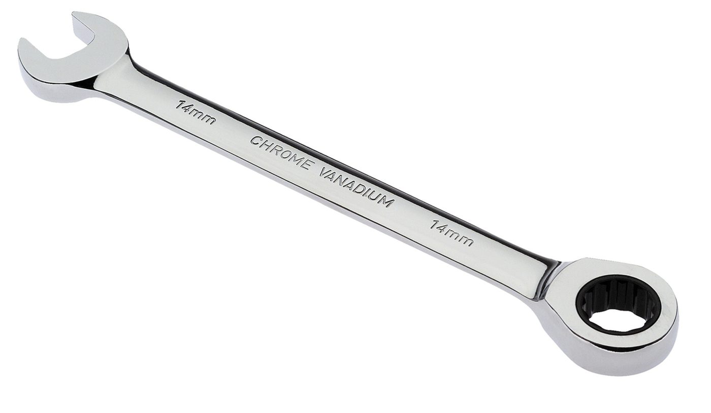 Ratchet combination wrench with fine toothing for ratcheting loosening or quick tightening of bolts and nuts in one go. 72 teeth stand for high performance and low return angles from as little as 5°. Left or right rotation by simply turning the wrench, with additional color marking. Open-end wrench tool with 15° offset for ergonomic working. Drop-forged from chrome vanadium steel, specially hardened, highly polished, nickel-plated and hard-chrome plated; 14 mm.