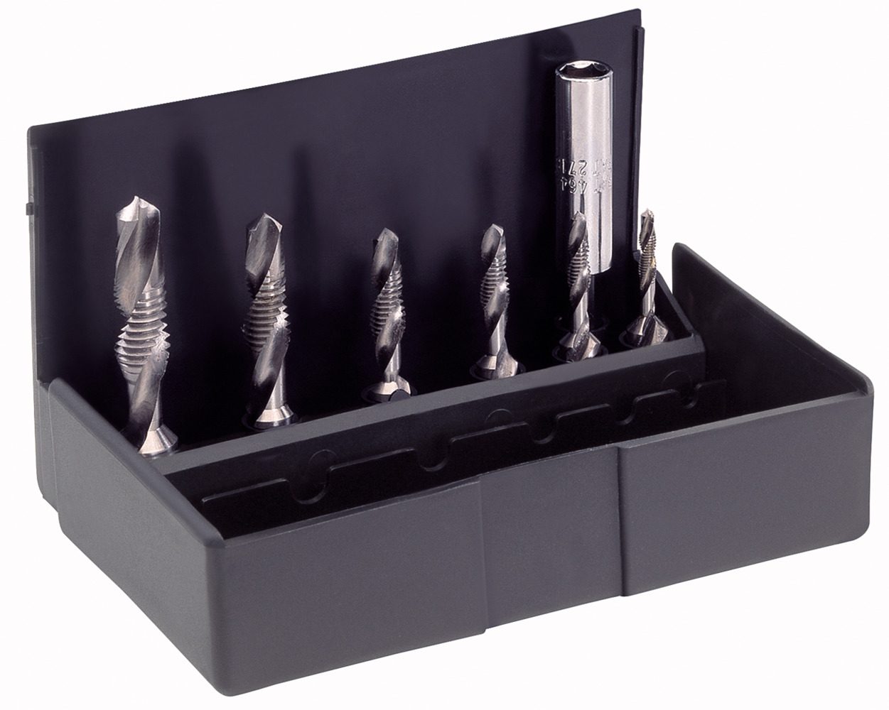 Combination tap assortment for core drilling, tapping and deburring in one operation, with 1/4" hexagonal shank. The field of application is in the machining of steel, non-ferrous metals and plastics. Especially useful for assembly work and small series, in practical plastic box. 1 piece each M3-4-5-6-8-10