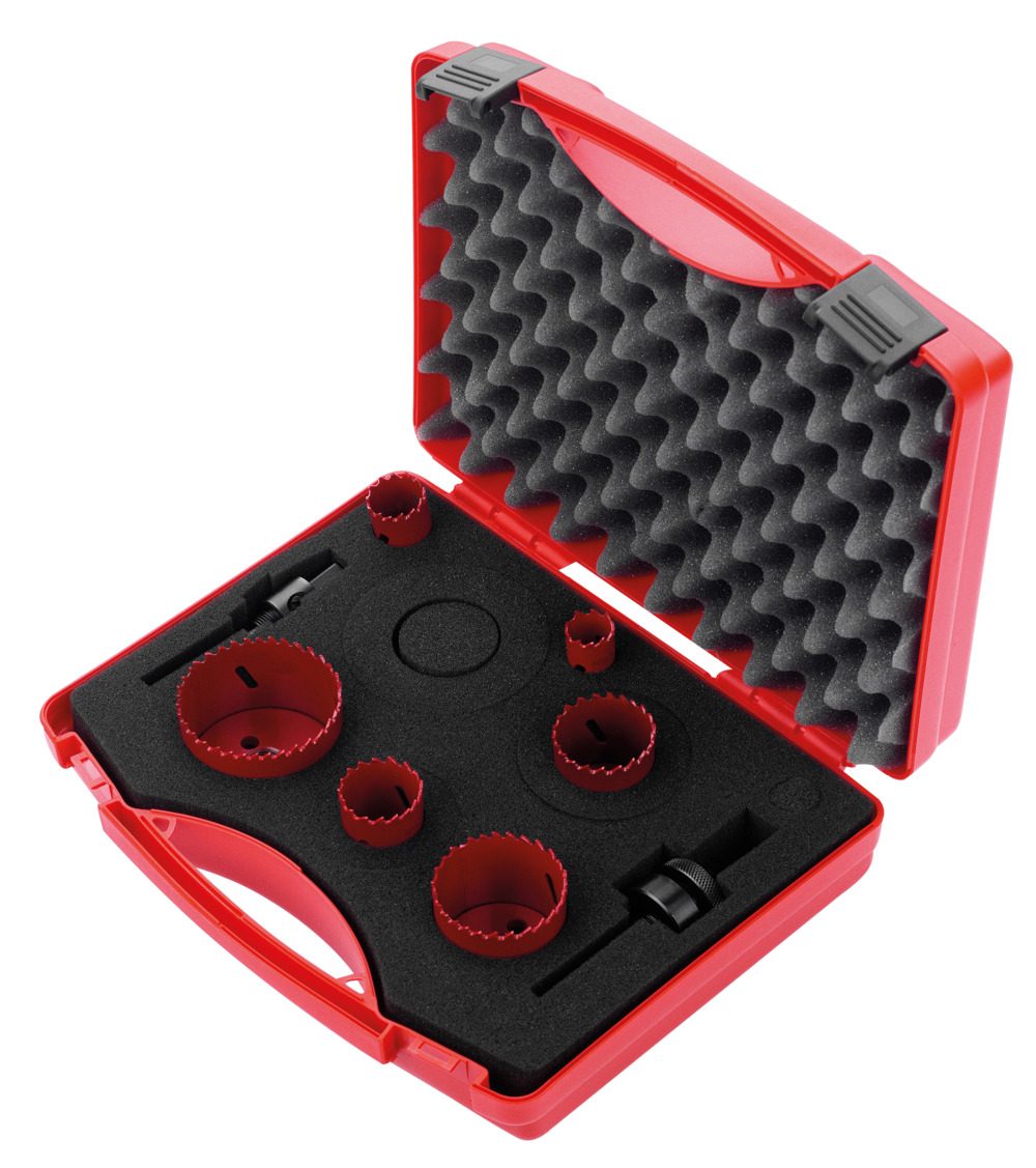 ELECTRICAL with 6 hole saws for drilling through holes for metric cable glands. Taken up with HSS guide drill, (CIMCO article no. 20 7580 and 20 7584) consisting of: with a Ø of 20 mm (20 7420), with a Ø of 25 mm (20 7425), with a Ø of 32 mm (207432), with a Ø of 40 mm (207440), with a Ø of 50 mm (207450), with a Ø of 64 mm(207464)