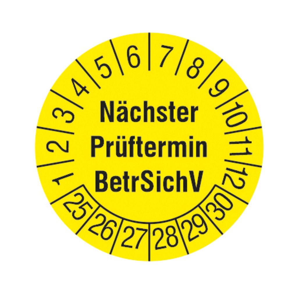 Inspection sticker "Next inspection date BetrSichV" for the years 2025 to 2030, 240 pieces, Ø 30 mm, yellow, incl. month and year wreath