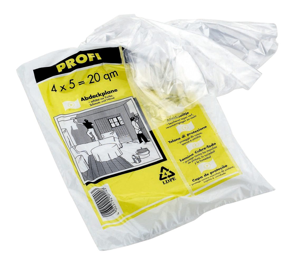 PE-HD tarpaulin, clear-transparent, made of recyclable polyethylene regenerated film, dimensions 4 mx5 m=20 m²; film thickness: 15µm