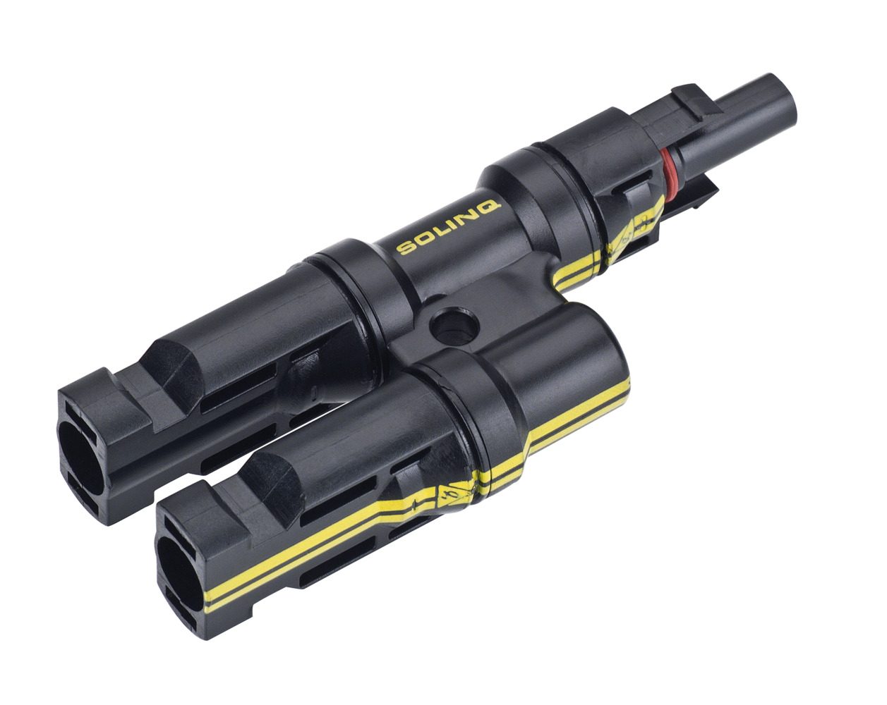 Photovoltaic Y-distributor compatible with the MC4 market standard. Technical data: Pin dimensions: Ø 4.0 mm, contact type: stamp roll contact, rated voltage: 1,000 V DC, rated current: 30 A at 70°C/25A at 85°C, contact resistance: <5 mOhm, protection class: IP 68, temperature range: -40°C/ + 90°C, certification: TÜV. Version: MMF = 1x female input and 2x male output
