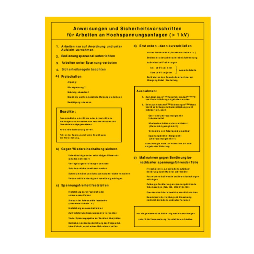 Safety notice "Instructions safety regulations" for work on high voltage installations" Material: plastic, yellow. Format: 300x400 mm
