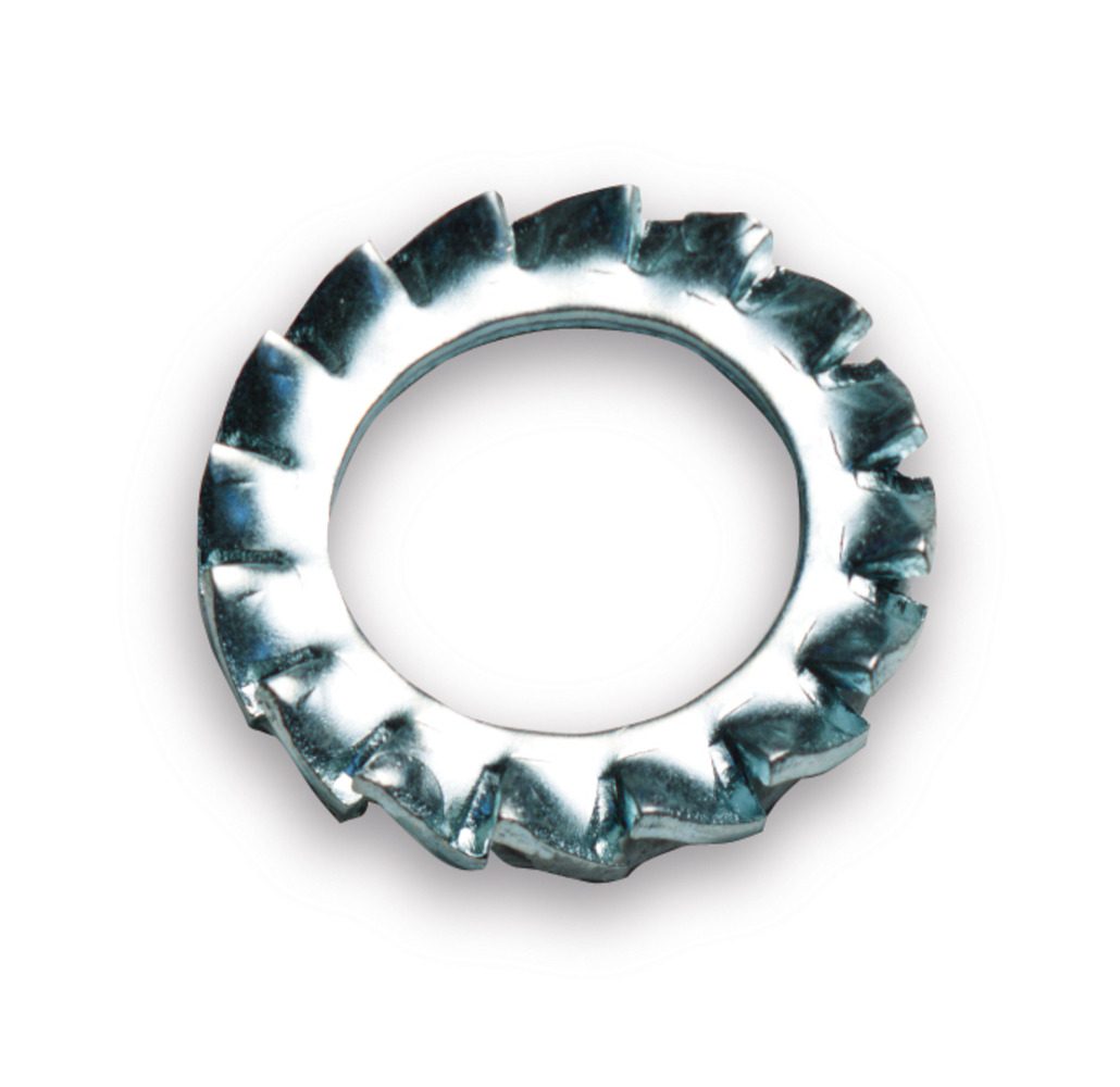 Serrated lock washer according to DIN 6798 form A external teeth, made of steel and galvanized. Design: for screws: M4; inner-Ø: 4,3 mm; outer-Ø: 8 mm; PU: 100.
