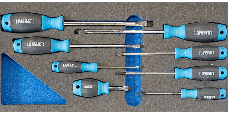 Bộ tô vít 2 cạnh 8 chi tiết được đựng trong khuôn mút xốp 4 lớp có 2 màu xanh – xám tương phản giúp dễ nhận biết vị trí của dụng cụ, sản phẩm chuyên dùng cho tủ đựng đồ nghề, hàng chính hãng FERVI Italia |