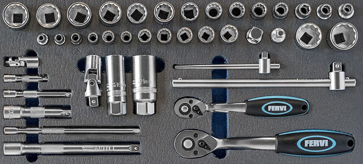 Bộ khẩu 30 món gồm các loại đầu socket có size từ 8-32mm + cần tự động, thanh nối dài, đầu lắc léo, thanh trượt chữ T – vuông 1/2 inch. Khuôn mút xốp chiếm 1/3 diện tích ngăn kéo. Dùng cho tủ đựng đồ nghề, hàng chính hãng FERVI Italia. |