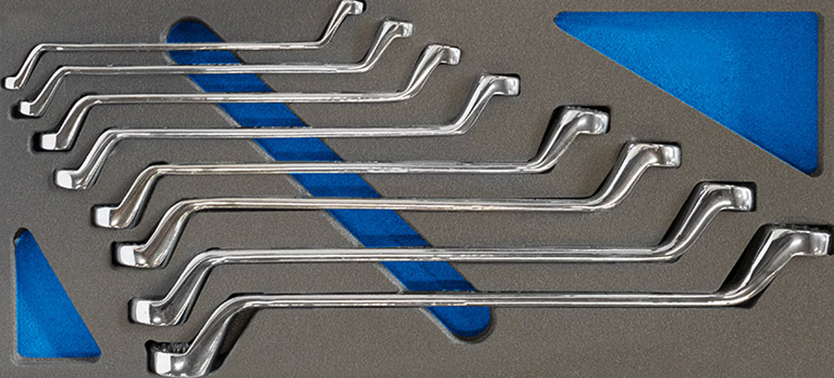 Bộ khóa 2 đầu vòng chữ Z 8 chi tiết có size từ 6-22mm, vật liệu bằng Chrome Vanadium, được đựng trong khuôn mút xốp 4 lớp có 2 màu sắc tương phản, chiếm 1/3 diện tích khoang chứa, sản phẩm chuyên dùng cho tủ đựng đồ nghề, hàng chính hãng FERVI Italia |