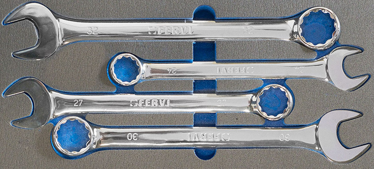 Bộ khóa khóa vòng miệng 4 cây loại lớn từ 24-32mm, vật liệu bằng Chrome Vanadium, được đựng trong khuôn mút xốp 4 lớp có 2 màu sắc tương phản, chiếm 1/3 diện tích khoang chứa, sản phẩm chuyên dùng cho tủ đựng đồ nghề, hàng chính hãng FERVI Italia |