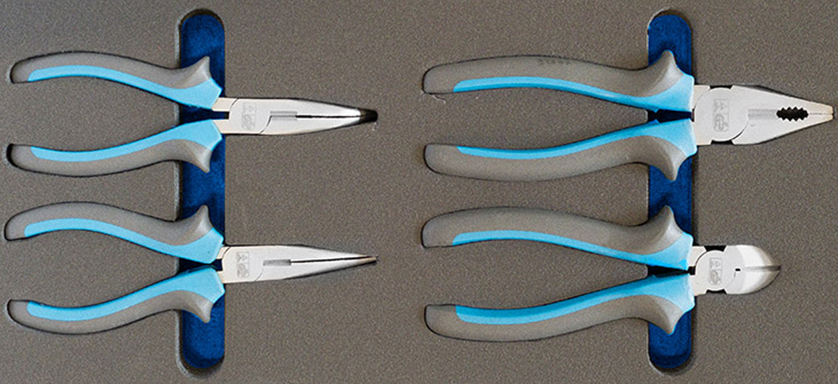 Module kềm 4 chi tiết bao gồm kìm cắt cạnh – kìm đầu bằng – kìm mỏ nhọn, được đựng trong khuôn mút xốp 4 lớp có 2 màu sắc tương phản, chiếm 1/3 diện tích khoang chứa, sản phẩm chuyên dùng cho tủ đựng đồ nghề, hàng chính hãng FERVI Italia |